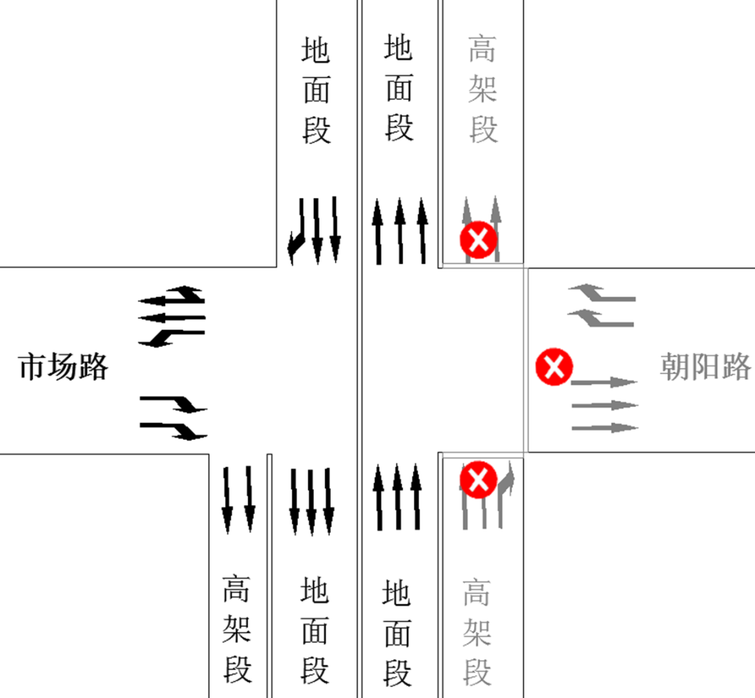 非机动车绕行路线: 朝阳路及市场路向北、江浦路(南向北)非机动车需增加绕行距离,通过江浦路桥下空间进行绕行。