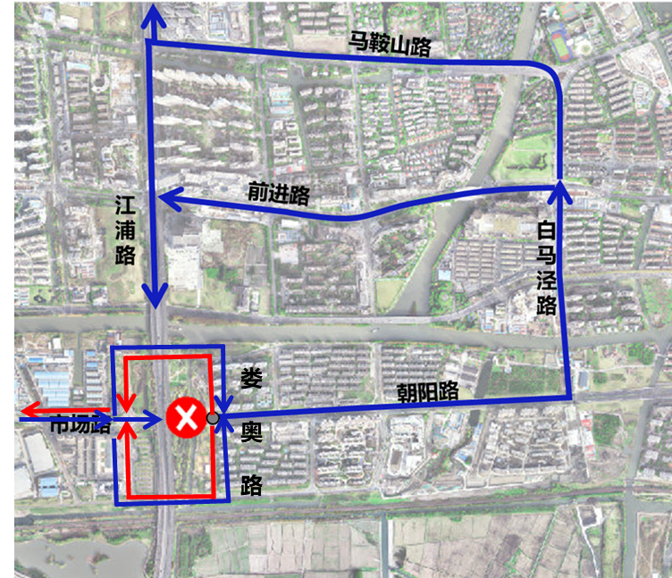 机动车辆绕行路线: 朝阳路-江浦路路口东侧机动车可由白马泾路至前进路、马鞍山路等市内路网绕行;朝阳路-市场路(东西向)车辆车辆行驶路线不变,继续利用南北环路绕行。