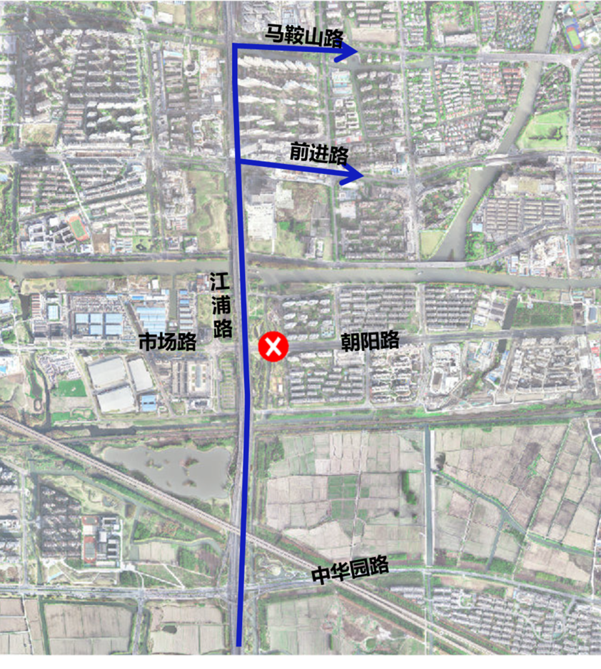 ▲朝阳路-江浦路路口东(西)侧机动车绕行路线:江浦路南口右转至朝阳西路车辆需从前进路、马鞍山路驶至周边路网绕行