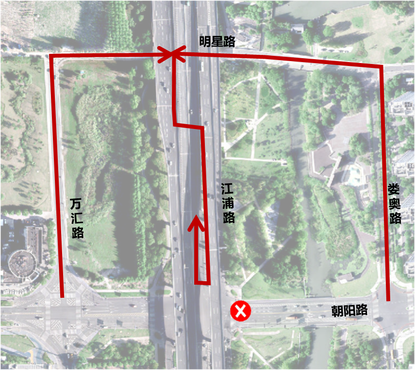 ▲朝阳路-江浦路路口南侧机动车绕行路线